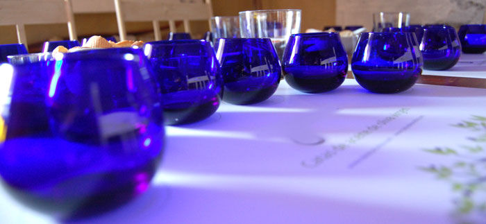 Una vez ubicados y con el mayor silencio posible, los catadores inician la actividad. Frente a ellos, están dispuestos los aceites que deben valorar en sus respectivas copas de cata y con el vidrio sobre las mismas. Cada copa contiene 15 ml. de aceite y está codificada para no conocer de qué aceite se trata.